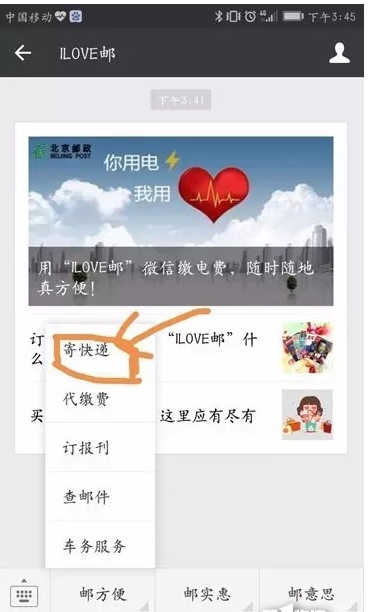 操作上与信筒快件业务类似,先提前备好快递包装袋或者包装纸箱。然后用北京邮政微信官方服务号“ILOVE邮”,选择寄快递。