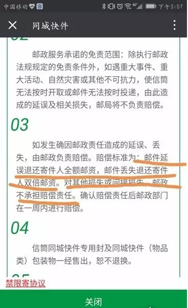 根据服务条款:“如果发生确因邮政责任造成的延误、丢失,由邮政负责赔偿。”