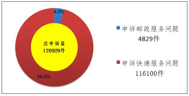 2017年8月,国家邮政局和各省(区、市)邮政管理局通过“12305”邮政行业消费者申诉电话和申诉网站共受理消费者申诉120929件。申诉中涉及邮政服务问题的4829件,占总申诉量的4.0%;涉及快递服务问题的116100件,占总申诉量的96.0%。
