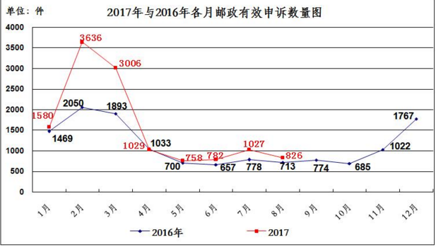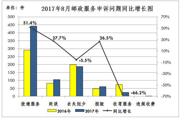 2017年8月,消费者关于邮政服务问题的有效申诉826件,环比下降19.6%,同比增长15.8%。