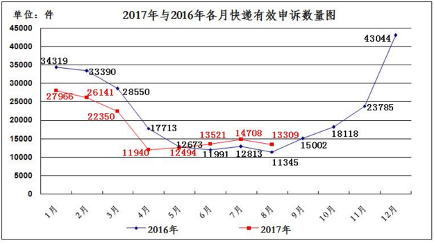 2017年8月,消费者关于快递服务的有效申诉13309件,环比下降9.5%,同比增长17.3%。