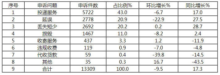 2017年8月,消费者对快递服务申诉的主要问题的与上月相比增长的有收寄服务和丢失短少。与去年同期相比,快递服务主要问题增长的有丢失短少、延误、投递服务和损毁,分别增长28.7%、27.5%、17.0%和2.4%。申诉比较集中的问题是投递服务、延误和丢失短少,占比分别为43.0%、20.9%和20.2%。