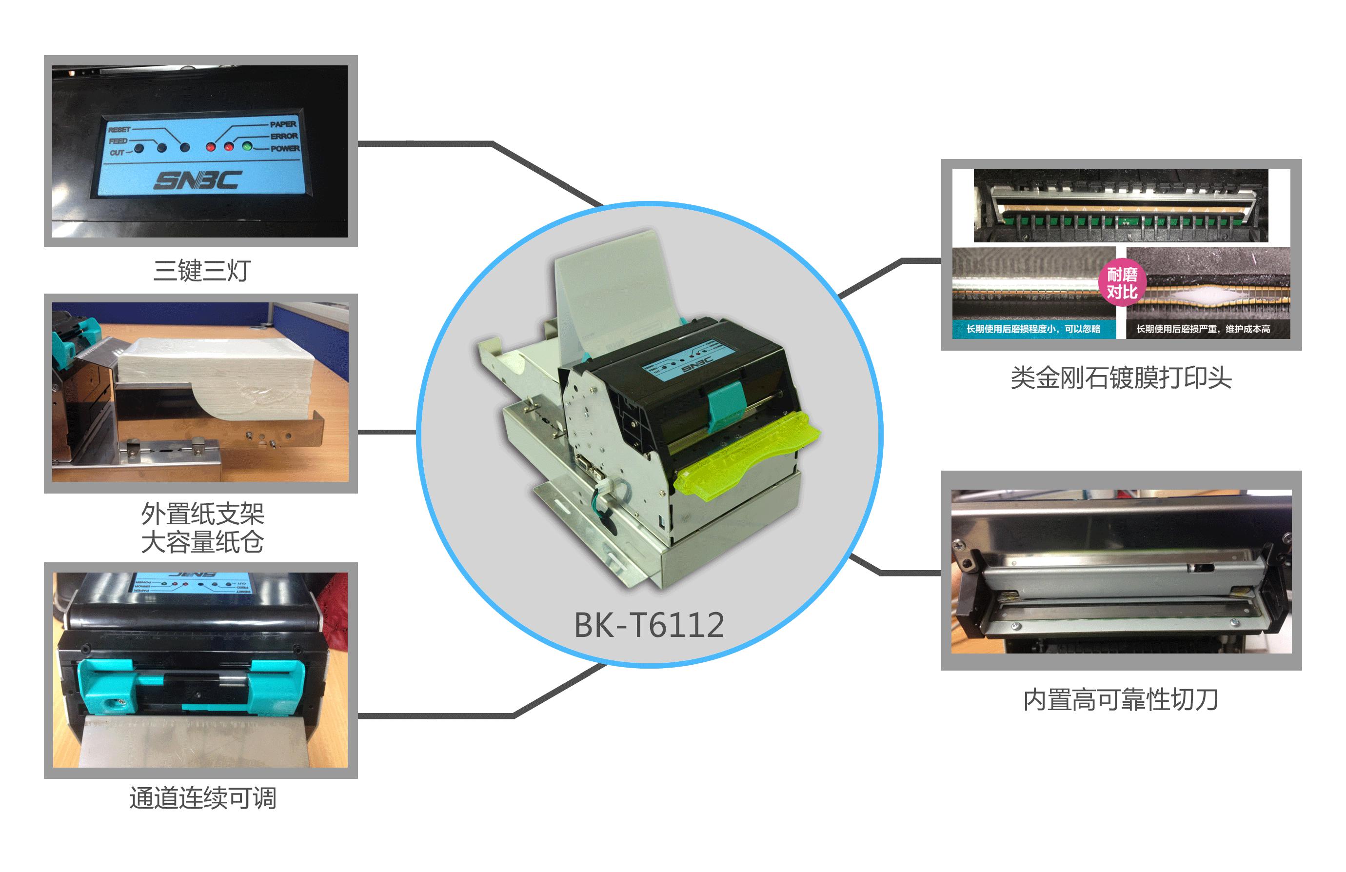 BK-T6112主体由出纸嘴、打印机芯、外置纸支架、底座组成,整机采用钣金结构设计,稳固牢靠,稳定性和使用寿命获得极大提高。