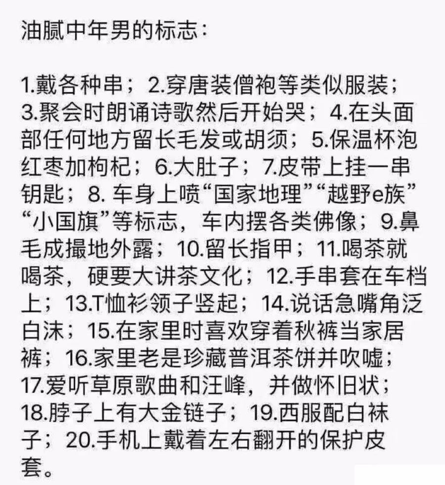 最近大家朋友圈疯传一篇《如何避免成为一个油腻的中年猥琐男》的文章,说实话这篇文章戳中了不少人的要害