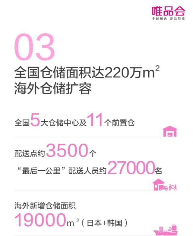 快速、高效、安全的把货物送达给用户,这是唯品会品骏物流始终坚持的初衷与使命,也是唯品会不断加大力度持续升级智能仓储、智能物流能力所期望达到的效果。唯品会通过电商+物流+金融“三驾马车”战略,重组物流板块,加大物流布局, 进一步加快物流运输速度,带动用户满意度的提高。截至目前,唯品会拥有遍布国内外的5个保税仓、14个前置仓 和9个海外仓,并为其跨境业务新增了约2.3万平方米的仓库,仓储总面积达240万平米;加之250多条公路运输干线、各大航空公司的货运专属舱位、国内5大仓储物流中心、覆盖全国县、乡镇的3700多个自营配送点等等,这支超过27000人的专业团队,日配送包裹能力已经可以达到500万单/天。