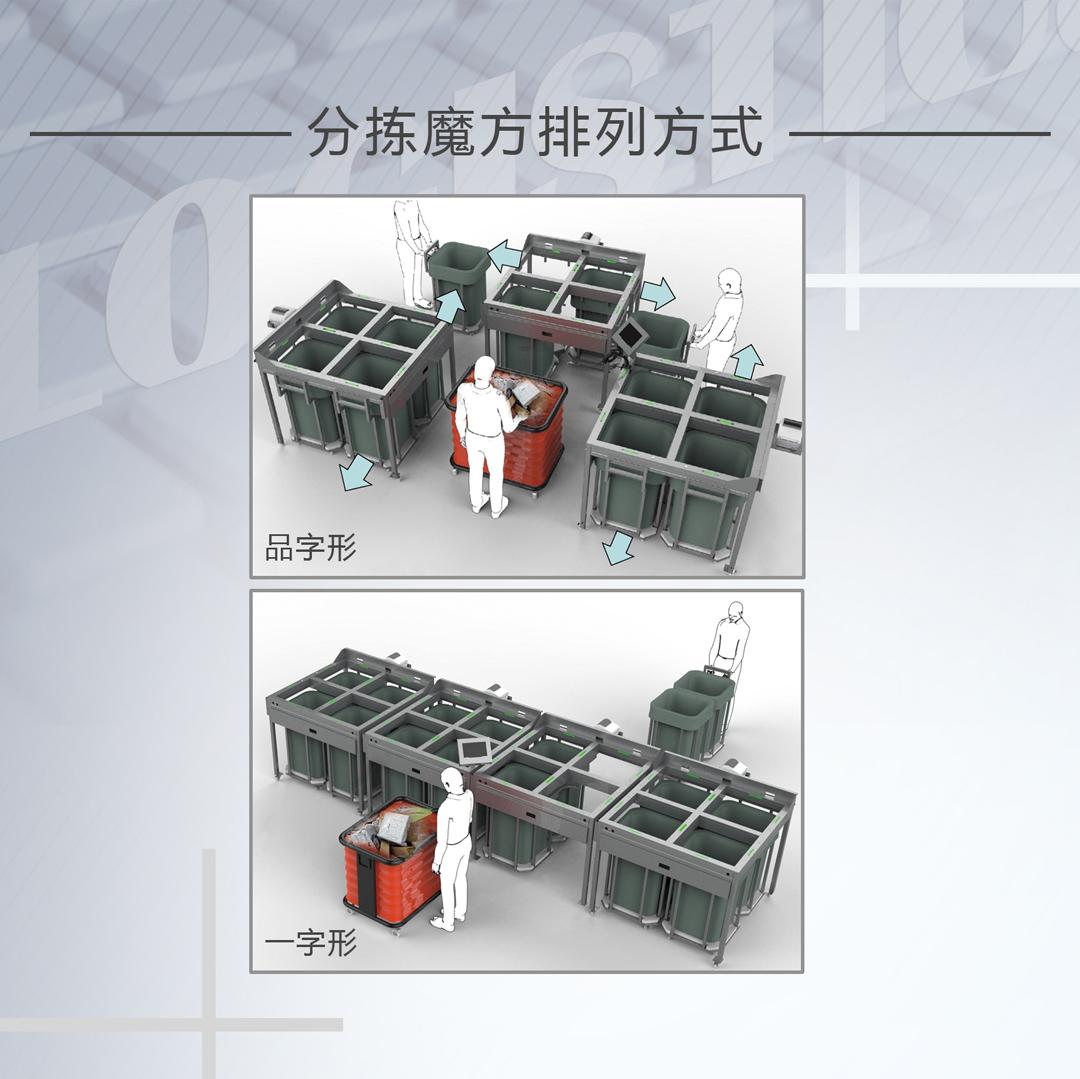 分拣魔方,名副其实好似一只百变魔方,采用了大容量、可拼接、可灵活移动的格口设计,用户可以根据不同的场地、使用场景和习惯来进行排布。无论是品字排布、还是一字排布,分拣魔方均能够轻松满足用户使用需求。
