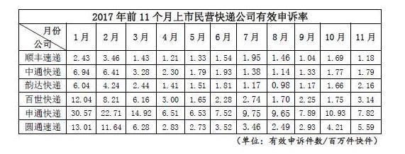 从同比来看,六家上市的民营快递公司,有效申诉率均有不同程度的下降。如申通去年11月的有效申诉率为10.52,今年11月降至7.82;百世快递从5.07降至3.14,降幅比较明显。