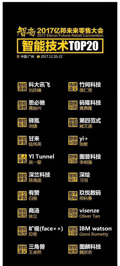 此次会议主办方亿邦动力网还推出了智能技术TOP20榜单,通过这个榜单我们可以看到人工智能时代确实已经通过零售电商来到了我们的身边。