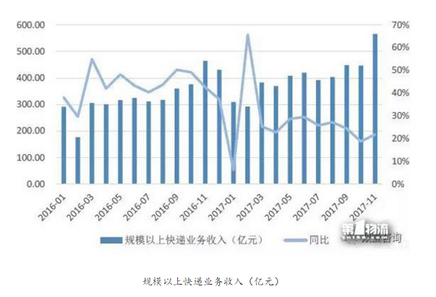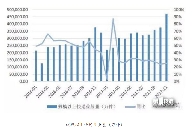 2017年快递行业业务量及业务收入依旧保持在高速增长通道中,前11个月规模以上快递业务量达到358.6亿件,同比增长28.6%;业务收入累计完成4437.4亿元,同比增长25.2%。相较于2016年的高增长,2017年无论从快递业务量及增速来看,均有明显下滑,但由于移动端渗透已经到达高位,网购习惯已经成熟,所以快递业务增速现下滑也在情理之中;另外相较于大多数行业,30%左右的业务量增速依旧属于高增长行业。