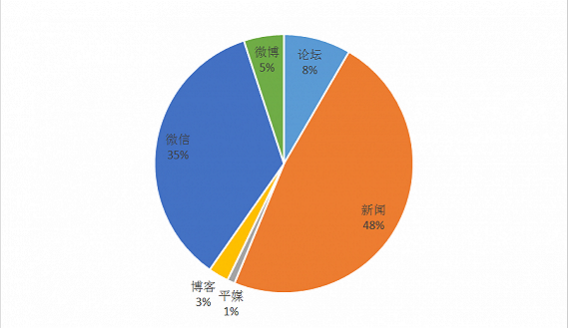 媒体分类上,新闻类传播占比最高,占总传播量的48%,其次是微信、论坛和微博分别占传播量的35%、8%和5%,博客、平媒则分别占总传播量的3%、1%。