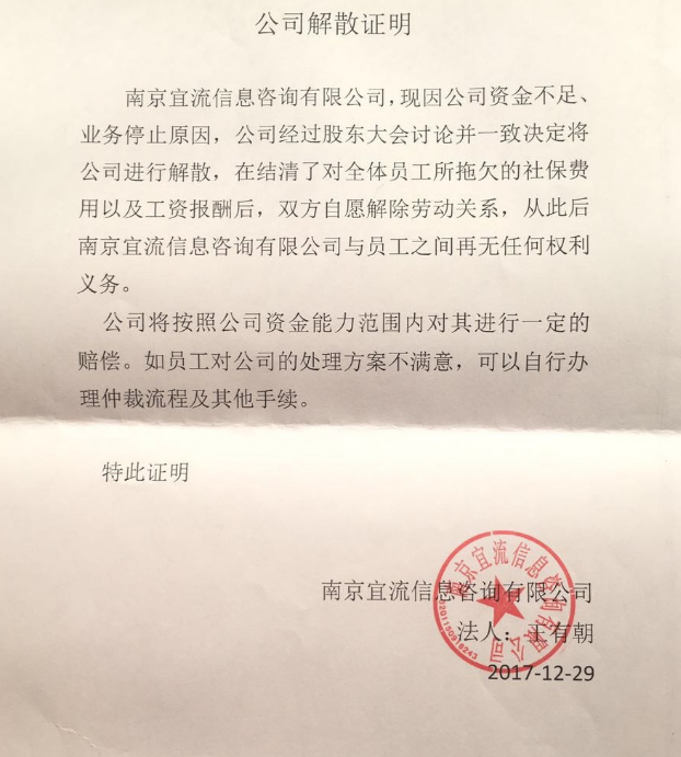 在运策物流给公司员工发放的公司解散证明中可以看到:公司因资金不足,业务停止运营是主要原因。在经过股东大会讨论并一致决定将公司进行解散,在结清了对全体员工所拖欠的社保费用以及工资报酬后,双方自愿解除劳动关系,从此后南京宜流信息咨询有限公司与员工之间再无任何权利义务。