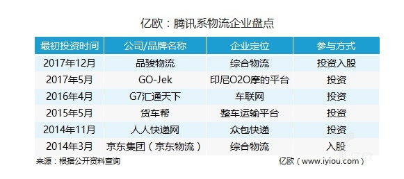 到2017年腾讯系的物流企业已经有汇通天下G7,饿了么、华南城、人人快递、货车帮、GO-Jek,以及京东物流。