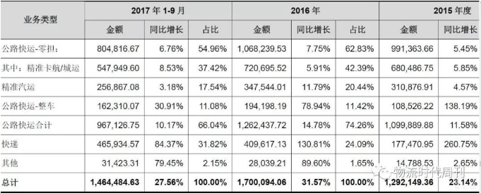 作为德邦快运业务中起价和单价较高的精准卡航、城运业务,其在公司业务结构中的占比较高。报告期内精准卡航、城运的收入占零担业务比例分别达到 68.38%、68.64%和 67.48%和68.08%(2014年、2015年、2016年、2017年(1-9月));货量占零担业务比例分别为 63.09%、60.81%、58.50%、59.26%(2014年、2015年、2016年、2017年(1-9月))。