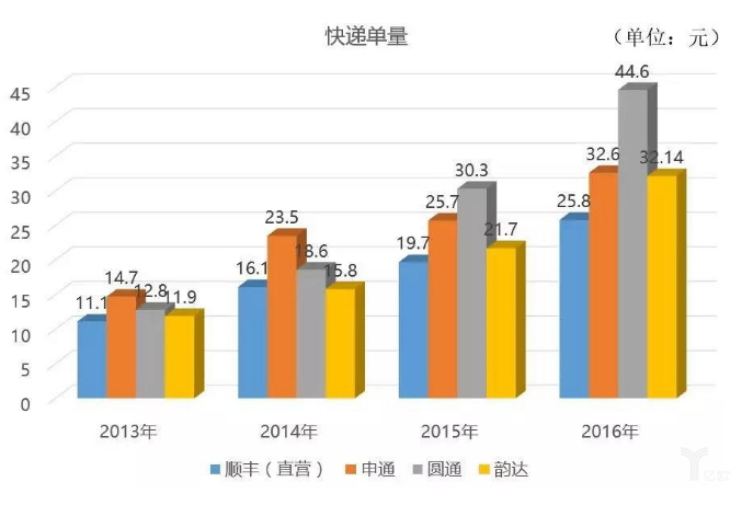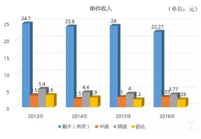 以阿里占股10%的圆通为例,在2013~2016年,它的业务量增速明显超过同期的申通、中通、韵达,但50%以上业务由电商件构成。按照2015年净利润7.17亿和30.3亿业务量来计算,圆通的单件净利润只有可怜的0.24元。如果有一个数字能代表电商件利润,那一定比0.24元还低。