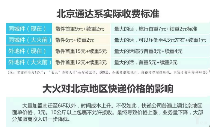 圆通随后涨价,在它们网点的墙上,甚至贴上了总部下发的指导价。这被同行视为大忌。中通的一名加盟商信誓旦旦,“我永远不会对客户开诚布公,这是找死。”那些习惯用1.2元/公斤发货的电商看到翻了几倍的价格后,立马消失得无影无踪。
