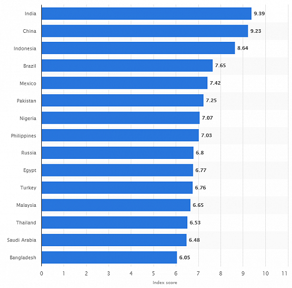根据statista数据显示,2017年新兴物流市场中,基于敏捷性新兴市场物流指数和按市场规模和增长分项的指数排名中,印度也分别高居第二名和第一名。