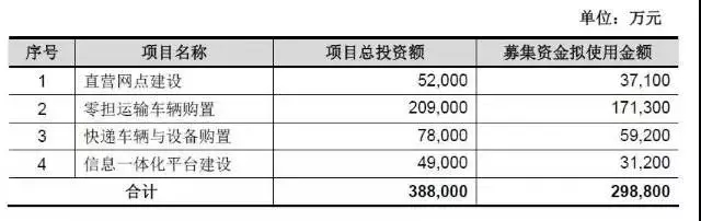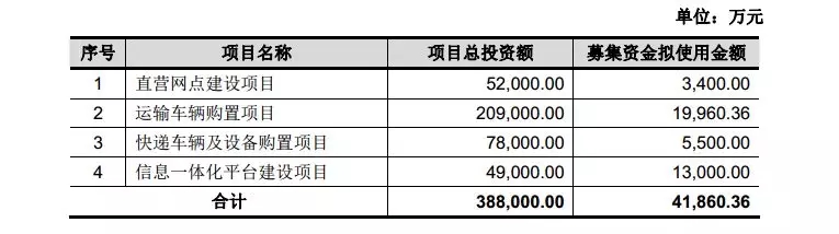 2018年1月发布的《招股说明书》显示,拟公开发行不超过1亿股A股,占发行后公司总股本的比例约为10.42%,计划募集资金41860.36万元,拟分别投入直营网点建设、运输车辆购置、快递车辆与设备购置和物流信息一体化平台项目。