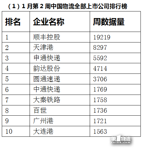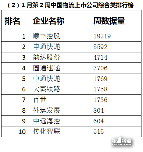 在1月第2周的中国物流上市公司综合类排行榜中,大秦铁路排名第五。主要传播内容围绕股价,“大秦铁路:2017年货物运输量同比增长23.10%”的消息让其被机构和股民关注。