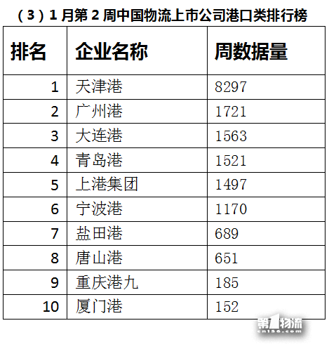 1月第2周的中国物流上市公司港口类排行榜中,广州港上升两个排名,排名第二。为历史最好成绩,《广州港跨入2000万标准箱港口行列》的消息最热