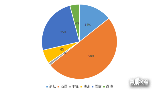 媒体分类上,新闻类传播占比最高,占总传播量的50%,其次是微信和论坛分别占传播量的25%和14%,博客、微博、平媒则分别占总传播量的6%,4%,1%。