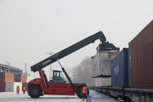 这是中国铁路哈尔滨局集团有限公司为满足农产品运输需求开发的“多式联运集装箱”班列货运新产品。图为集装箱装运现场。记者 王海斌 摄