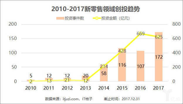 IT桔子统计了截止2017年12月31日新零售领域的创投数据,将以这些数据为基准,同大家一同探讨2017年新零售领域的发展轨迹和未来发展趋势。