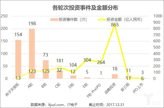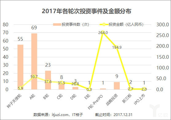 2017年新成立57家公司,全年共发生172起投资事件,总投资额达625.36亿人民币。与2016年相比,投资事件数量同比增长60.75%,投资金额同比减少6.58%。