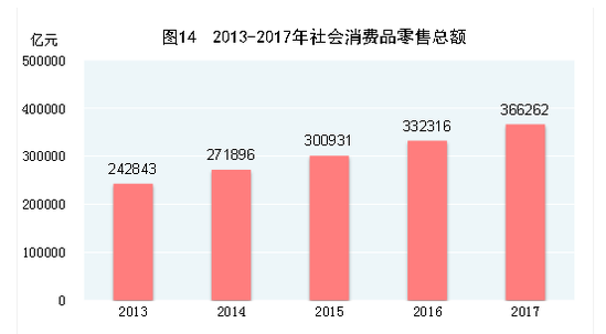 在国内贸易方面,全年社会消费品零售总额366262亿元,比上年增长10.2%。按经营地统计,城镇消费品零售额314290亿元,增长10.0%;乡村消费品零售额51972亿元,增长11.8%。按消费类型统计,商品零售额326618亿元,增长10.2%;餐饮收入额39644亿元,增长10.7%。