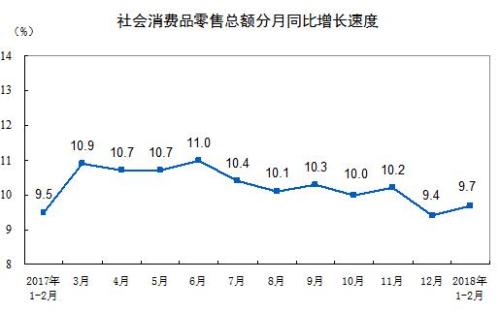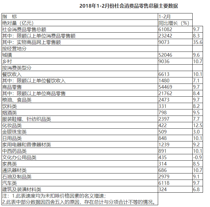 据国家统计局网站消息,2018年1-2月份,社会消费品零售总额61082亿元,同比名义增长9.7%。其中,限额以上单位消费品零售额23242亿元,增长8.3%。