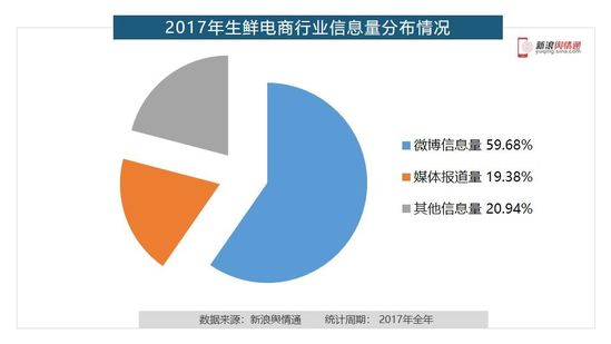 据新浪舆情通大数据分析显示,2017年,生鲜电商整体网络舆情传播热度指数5.42,全年相关舆情信息量197.14万条,微博信息量和媒体报道量为主要信息来源,分别占比59.68%和19.38%。
