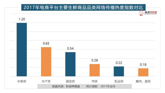 在电商平台主要生鲜产品品类热度方面,据新浪舆情通大数据分析显示,2017年,水果类商品所受舆论关注较高,全年网络舆情传播热度指数1.20,高于其他主要生鲜食品品类,水产类商品、蔬菜类商品、肉类商品、乳品类商品以及禽肉、蛋类商品全年热度位列其后。