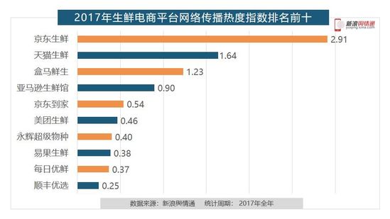 据《每日经济新闻》报道,天猫生鲜目前占据着我国生鲜电商市场超过80%的市场份额,但在2017年舆论关注度方面,京东生鲜却更为抢镜。据新浪舆情通大数据分析显示,2017年,在主要生鲜电商平台中,京东生鲜全年网络舆情传播热度指数2.91,领跑其他生鲜电商平台,天猫生鲜、盒马鲜生、亚马逊生鲜馆、京东到家、美团生鲜、永辉超级物种、易果生鲜、每日优鲜、顺丰优选全年热度紧随其后。