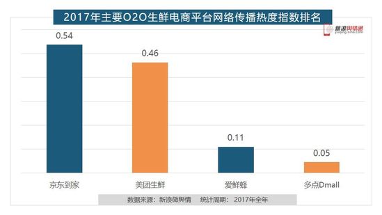 O2O生鲜电商则通过与便利店或超市的合作,进行生鲜产品的销售,配送范围一般不超过5公里,可在2小时内送达,能够满足用户的及时性需求。在主要O2O生鲜电商平台中,据新浪舆情通大数据分析显示,2017年,京东到家、美团生鲜所受舆论关注较高,爱鲜蜂、多点Dmall热度排名位列其后。