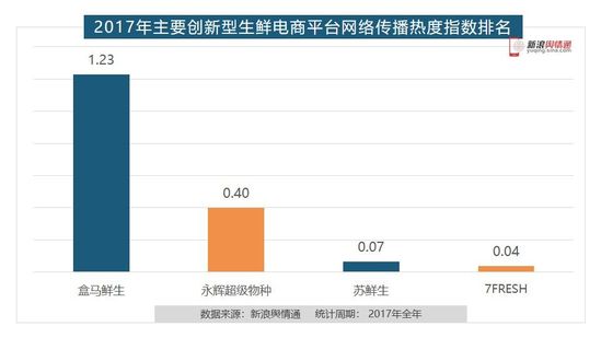 据新浪舆情通大数据分析显示,在主要创新型生鲜电商平台中,2017年盒马鲜生所受舆论关注明显高于其他平台,全年网络传播热度指数1.23,媒体报道量7.59万条,永辉超级物种、苏鲜生、7FRESH所受舆论关注紧随其后。