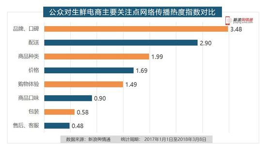 在舆论对生鲜电商主要关注点方面,据新浪舆情通大数据分析显示,2017年至今,品牌、口碑成为公众通过电商平台进行生鲜商品购物时最为关注的内容,此外,生鲜电商的商品配送、种类、价格、购物体验、商品口味、商品包装以及售后也较受舆论关注。