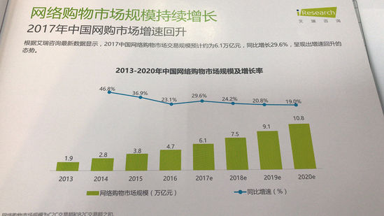数据显示,2017年中国网络购物市场交易规模预计约为6.1亿元,同比增长29.6%,较前几年有小幅度的回升。