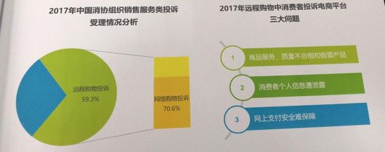 在远程购物中,消费者投诉的对象包括电商平台、以微商为代表的个人网络商家和电视购物等。其中,电商平台被投诉的三大问题为:商品服务、质量不合格和假冒商品问题;消费者个人信息遭泄露;网上支付安全难保障。