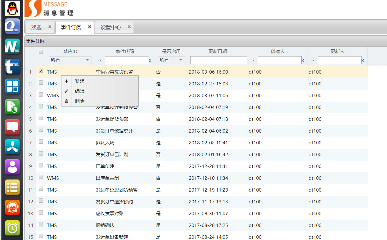 每家企业租户需要监控与预警的事件各不相同,科箭基于多年的行业积累及最佳实践,对物流执行各环节进行了细致的流程节点划分,对每个流程节点预置了事件场景,如发货通知、车辆异常提货预警、排队入场提醒、发运单延迟到货预警、库龄告警、安全库存告警等。用户可选择预置订阅事件进行编辑,也可以完全根据自己企业的需求新建订阅事件。