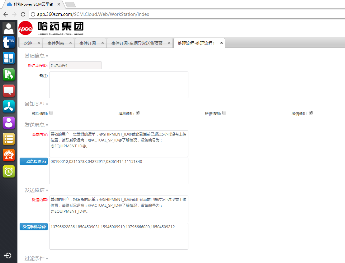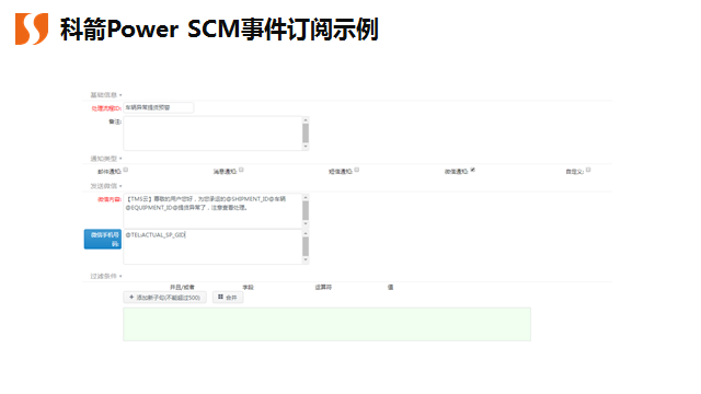 信息爆炸时代,每人每天平均要收到2条以上垃圾短信,一些重要消息很可能被遗漏。科箭的事件管理功能让每家企业可以按照自己用户的习惯,选择以何种方式发送提醒与预警,如邮件、系统消息、短信、微信等。