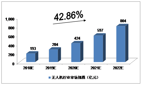 2015年,中国无人机市场总规模约为66.6亿元,同比增长48%,约占全球市场规模的15%。我们预计,2018年无人机行业市场规模将达到193亿元,未来五年(2018-2022)年均复合增长率约为42.86%,2022年市场规模将达到804亿元。