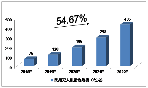 2014年,国内民用无人机产品销售规模约15亿元,2015年销售规模达到23.3亿元,同比增长55.3%。我们预计,2018年民用无人机销售规模将达到76亿元,未来五年(2018-2022)年均复合增长率约为54.67%,2022年销售规模将达到435亿元。