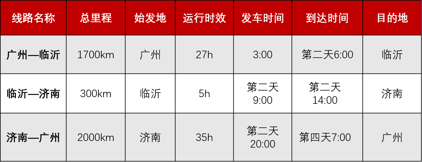 此条线路使用公路袋鼠的甩挂运力运输,由传化智联济南分拨中心到达广州分拨中心的时效为33小时。而广州分拨中心到达临沂分拨中心的时效为27小时,由临沂传化公路港发往济南传化分拨中心的时效为5小时。