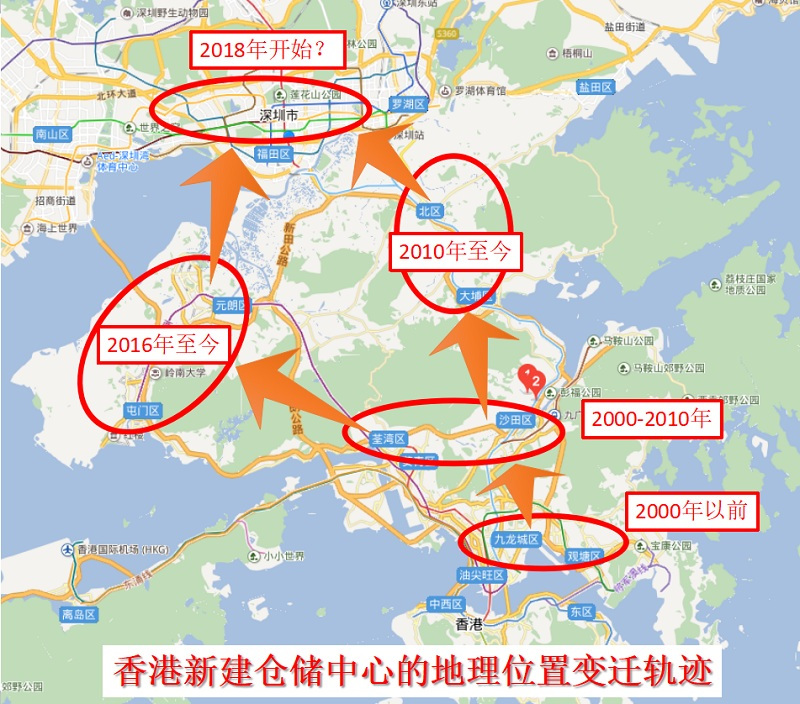 知名地产服务投资公司——世邦魏理仕发布报告指出,自2014年以来,香港本地的仓库空置率长期在0.3%-1%之间浮动,且有逐步走低的趋势。低空置率直接体现了香港仓储业供不应求的状况,并且这种状况有愈演愈烈的趋势。对此,世邦魏理仕表示:“长此以往,如果香港仓储空间仍然十分有限,零售商和物流运营商很可能别无选择,只能搬迁至其他地区,比如香港北面,甚至是深圳”。我们回顾香港仓储业过去20年的发展变迁轨迹,可以发现这个判断跟香港新建仓储中心的地理位置变迁轨迹是相符的,香港大型仓库的选址,逐渐由港口周边迁往更“地广人稀”、更靠近内地的北部地区,港口周边的九龙、观塘等区域,则逐渐成为旅游购物的“圣地”。