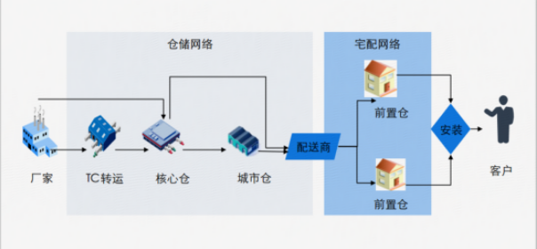 大家电B2C物流模式以仓配一体为主,运营上则主要由仓储网络和宅配网络两部分构成