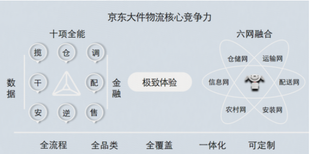 京东物流基础设施面积超过1000万平方米, 已成为全国拥有最大规模基础设施的物流企业。近年来,京东物流大力布局大件网络,目前已覆盖大陆所有行政区县,近60万行政村。基于仓储、配送等能力,京东物流打造了仓、运、配、调拨、安装、逆向等十项全能服务。