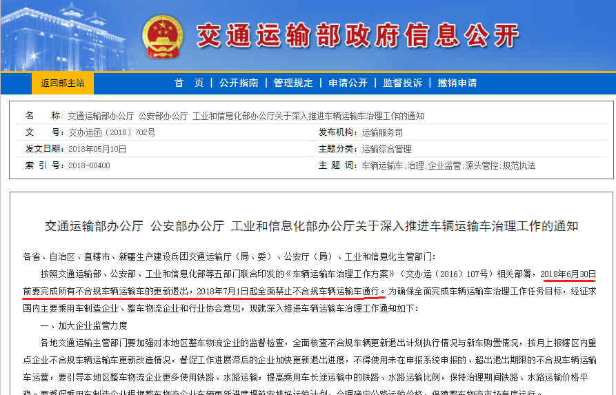 7月1日大限将至,不合规车辆运输车将全面禁止通行。交通运输部、公安部及工业和信息化部(下文简称三部委)在5月10日发布关于深入推进车辆运输车治理工作的通知,再一次强调2018年7月1日起全面禁止不合规车辆运输车通行。确保在规定时间完成所有不合规车辆运输车的更新退出。