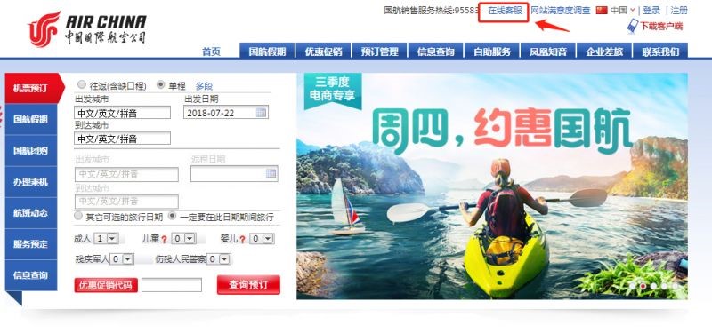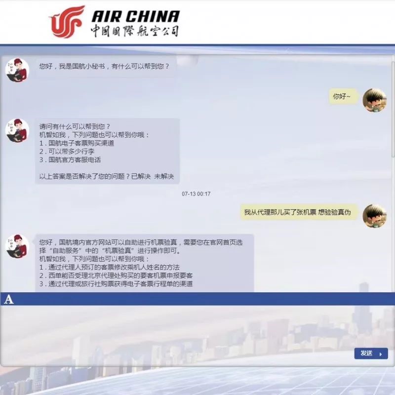 通过访问国航官网,点击右上角的在线客服,乘客就能直接与国航小秘书对询问沟通了。