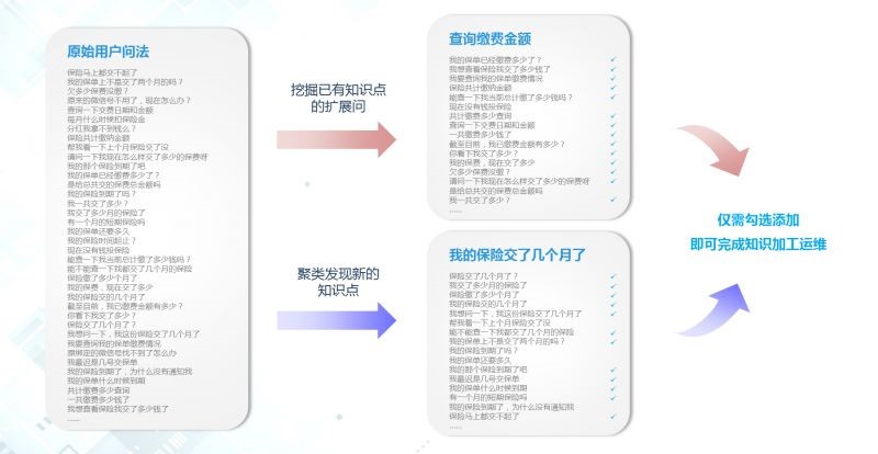 知识自动挖掘:系统能够应用客服中心积累的对话数据,发现已有知识点的相似提问,还能够进行无监督聚类(无需人工参与),自动挖掘出新的知识点,辅助知识加工人员进行知识点归纳。