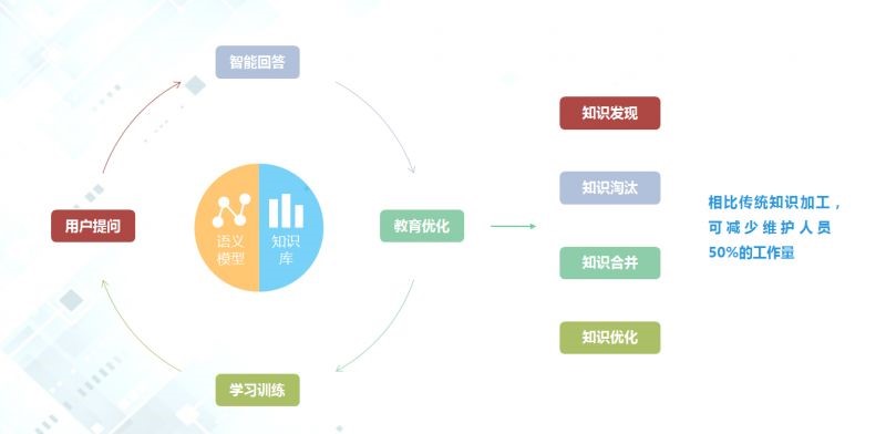 持续调优:系统上线后,围绕语义模型和知识库所组成的智能问答核心,可根据用户问答数据,对知识库进行维护,再使用维护后的知识库对语义模型进行训练,不断自我学习、自我迭代,持续提高问答准确率,实现智能客服越用越聪明的效果。同时具有新知识发现、旧知识淘汰、知识合并、知识优化等功能。
