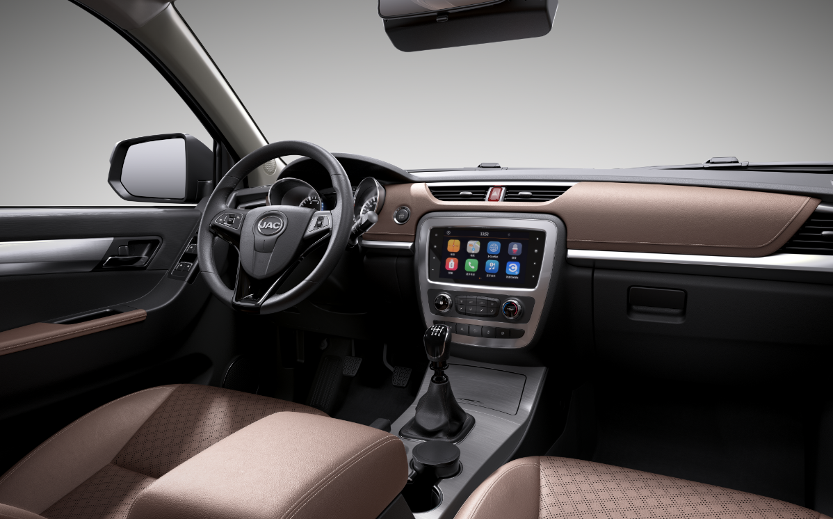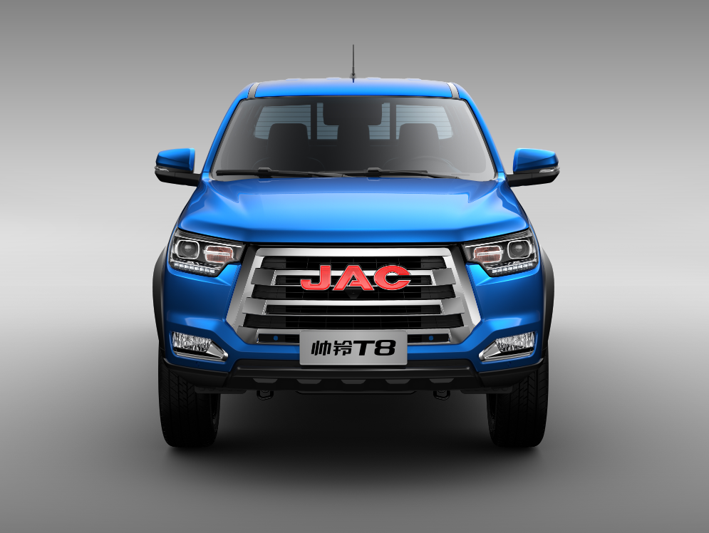 即将上市的帅铃T8中网采用盾牌格栅,更加坚定、自信、阳刚,极富视觉冲击力。大灯采用了全新的一体式硬派组合灯组,远近光一体透镜大灯,扁平式镀铬灯圈,长条LED日间行车灯,搭配五边形雾灯,整个前脸看起来威猛帅气。